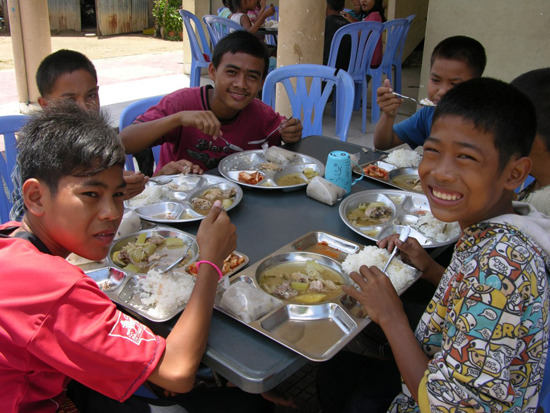 (사진: 박정연) 프놈펜 소재 한 고아원 원생들이 자원봉사자들이 제공한 음식으로 점심식사를 하고 있는 모습. |