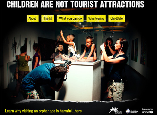 (사진: 프렌즈인터내셔널) 국제 비정부기구(NGO)인 프렌즈 인터내셔널(FI) 캄보디아 지부는 유니세프와 함께 '반(反)볼런티어 관광' 캠페인을 벌이기도 했다. '어린이는 여행상품이 아니다'라는 슬로건을 내건 이 캠페인은 서양 여행자들이 유리상자에 갇힌 제3세계 어린이들을 카메라로 찍고 있는 내용의 홍보사진을 앞세워 볼런티어 관광에 대한 경각심을 일깨우고 있다. |