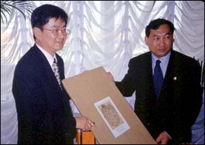 | 안경환 교수가 노로돔 시리부드 왕자에게 고지도 달력을 증정하는 모습 | 음식을 주문하고, 왕자는 천천히 입을 열었다. 그리고 거의 두 시간 동안 혼자 얘기한다. 프랑스에서 공부하였으나 영어는 유창하고 훌륭하다. 간혹 내용을 놓치기는 하지만, 그의 어조는 품위가 있다. 열심히 접시를 비우며, 부드럽고 진지한 영국 신사 같은 그의 목소리만 감상한다. 질문이 있어도 당황할 필요는 없다. 안경환 교수가 도맡아 대답을 하니까.