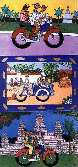 남는 시간을 해피페인팅에서 보내기로 한다. 벽에는 온통 원색의 실크스크린, 캄보디아의 이모저모를 일회용 카메라로 찍어 놓은 듯하다. 오토바이 뒤에는 네 명, 시클로 앞쪽엔 여섯 명이 타고 있다. 뒷배경은 앙코르와트, 아니면 소도구로 앞쪽에 해골바가지를 배치한다. 뛰노는 아이들이나 과일 광주리를 이고 있는 여자들이나 모두 즐겁다. 해먹을 매단 나무 기둥에 거울을 달고 이발을 한다. 자르는 사람이나 잘리는 사람이나 모두 웃는다. 그래서 이 그림들을 그냥 해피 캄보디아라고 부른다.