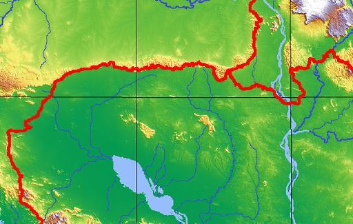 캄보디아 북부 지방의 태국(상단 좌측), 라오스(상단 우측) 국경 근처의 산악지대가 표시된 지도. 이 사진은 미국 상무성 산하 <국가 지구물리학 데이타센터>의 지형도에서 "크메르의 세계"가 부분 발췌한 것이다. 아래쪽에 떤레 삽 호수가 보이고, 캄보디아 평원은 보다 진한 초록색으로 되어 있다. 태국과 캄보디아 국경을 이루는 "당렉산맥"의 남사면인 캄보디아 영토는 대부분 급격한 절벽으로 형성되어 국경선을 제하고 나면, 지도상에서 별다른 산악 표시(노란색)를 볼 수 없다. 반면 태국 영토인 북사면은 완만한 경사를 이루며, 태국의 코랏고원(상단의 연두색 지역)으로 이어진다. 좌측 상단 태국 영토 안에 보이는 보다 큰 산악지대는 "동파야옌 산맥"으로 그 끝자락과 "당렉산맥"의 서쪽 끝자락이 서로 접해져 있다. "당렉산맥"은 우측에 수직으로 뻗어내려오는 메콩강에서 시작하여 "동파야옌산맥" 전에서 끝난다. 당렉산맥의 가장 높은 지형은 캄보디아-태국-라오스 국경선이 서로만나는 "총복" 지역이다. |
