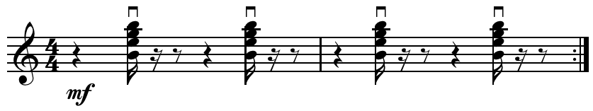 '스카 스트로크'는 일종의 '바운싱 리듬'(bouncing rhythm: 바운스된[튕겨오르는 듯한] 리듬)을 만들어주며, 피치(pitch: 음의 높낮이) 면에서 고저를 이동한다.(주4) '스카 스트로크'는 4분의 4박자로 연주하면서 기타 코드(guitar chord)는 다운비트(downbeat: [역주] 마디의 첫번째 박자)에 연주하고, 업비트(upbeat: [역주] 마디의 끝 박자)에서는 왼손을 프렛(fret: 지판)에서 몇 mm만 이격시켜 고스트 노트(ghost note, 묵음)를 연주한다.(주4) 하지만 대부분의 '고전 스카'(traditional ska) 음악들은 업비트에 초점을 맞추는 반면, '레개'는 다운비트에 초점을 맞추는 경우가 더 많은데, '스카'와 달리 '레개' 음악에서 사용되는 '스카 스트로크'가 더욱 느리게 연주된다.