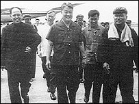 (사진: BBC) 크메르루즈 정권 시절, 프놈펜 공항 영접에 나온 이엥 사리(좌측). 가운데 인물은 중국대사 순 하오(Sun Hao), 그리고 우측 인물은 누온 찌어(Nuon Chea)이다.