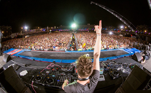 (사진: DJ Master Course Blog) 일렉트로닉 뮤직 페스티발 무대 위에서 관중을 이끌며 음악을 믹싱 중인 DJ의 모습.