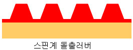 - 스핀계 돌출러버는 스피드계 돌출러버와는 달리 스핀이 매우 잘 걸리는 러버입니다. 돌기의 모양은 옆에서 볼 때 그림과 같이 사다리꼴 모양을 하고 있으며 정면에서 보면 돌기 자체의 면적도 넓은 편입니다. 공이 빨리 떨어진다는 돌출러버 본래의 특성은 약간 부족한 반면 스핀이 잘 걸리기 때문에 사용하기 편합니다.