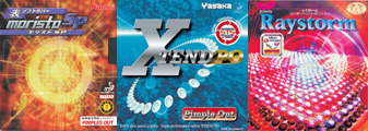 - 스피드글루 효과를 내장한 스핀계 돌출러버의 대표적인 제품은 닛타쿠 "모리스토 SP(Moristo SP)", 야사카 "엑스텐드 P.O.(XTEND P.O.)", 버터플라이 "레이스톰(Raystorm)" 등입니다.