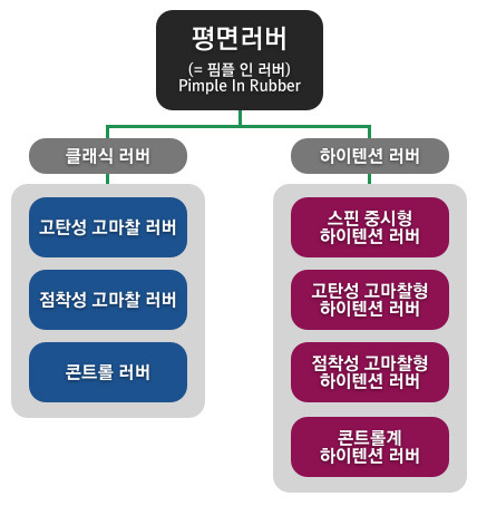 평면러버는 국제탁구연맹( ITTF)의 정식 명칭으로는 "핌플 인 러버(Pimples In Rubber)"로 불립니다. 규정상의 공식적인 분류는 핌플 인 러버라는 한 가지 뿐입니다만 실제로 사용되는 핌플 인 러버들은 몇 가지 종류로 다시 구분됩니다. 기본적으로는 위의 그림과 같이 7가지로 구분할 수 있습니다. 그림에서는 핌플 인 러버를 크게 왼쪽의 "클래식 러버"와 오른쪽의 "하이텐션 러버"로 구분하고 있는데, 이는 스피드글루 효과를 러버 본체에 내장하고 있는가에 따른 분류입니다. "스피드글루"라는 것은 1970년대 말에 발견되여 2008년 9월 전면 금지되기까지 오랫동안 사용되던 특수한 접착제인데, 이를 러버에 바르면 일정 시간 동안 러버의 스피드와 스핀 성능이 크게 향상되기 때문에 탁구에서 광범위하게 사용되어 왔습니다. 그러나, 2008년 9월부터는 "러버에 무엇인가를 발라서 처리하여 성능을 향상시키는 행위"가 국제탁구연맹에 의해 금지되었기 때문에 스피드글루 또는 그와 유사한 효과를 갖는 모든 물질을 사용할 수 없게 되었습니다. 각 용품사들은 스피드글루의 금지를 예견하고 그 효과를 러버 자체에 영구적으로 내장시키는 연구를 해 왔는데, 그렇게 해서 만들어진 것이 바로 "하이텐션 러버"입니다. 또, 스피드글루 효과를 내장하지 않고 있는 옛 방식의 러버를 "클래식 러버"라고 편의상 구분합니다. (클래식 러버라는 공식 명칭이 있는 것이 아닙니다.)