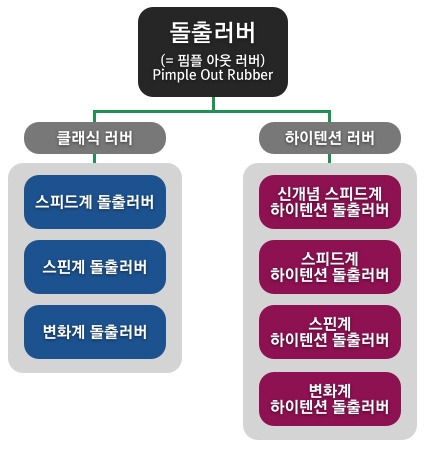 하이텐션 러버가 존재하지 않던 옛날에는 핌플 인 러버를 고탄성 고마찰 러버, 점착성 고마찰 러버, 콘트롤 러버라는 3종류로만 구분하였습니다. 그것이 바로 그림의 왼쪽에 표시된 3가지 종류입니다. 그리고, 이후 하이텐션 러버가 등장하면서 이 3가지 종류가 각각 하이텐션 러버로 발전하였는데, 2009년부터 여기에 새로운 종류인 "스핀 중시형 하이텐션 러버"라는 것이 추가되어 현재는 핌플 인 러버를 7가지로 구분할 수 있게 되었습니다.
