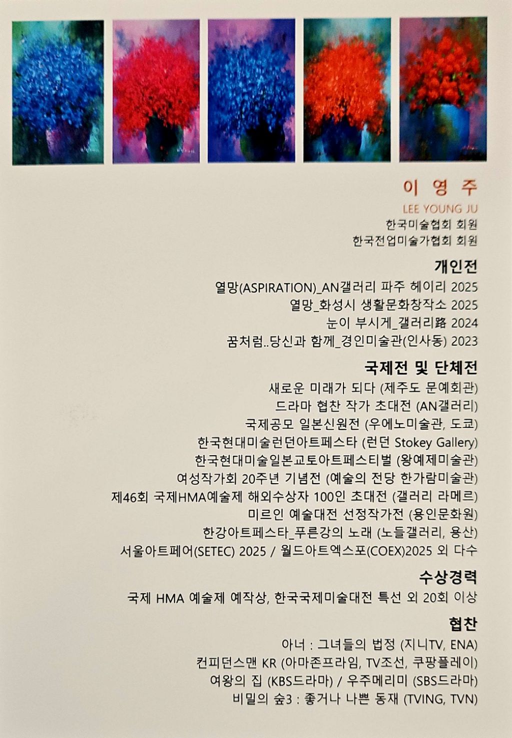 이영주작가(화성생활문화창작소)전시 작성자박상희|작성시간26.03.10|조회수6 목록 댓글 0 글자크기 작게가 글자크기 크게가 다음검색 현재 게시글 추가 기능 열기 북마크 공유하기 신고 센터로 신고 댓글 댓글 0 댓글쓰기 답글쓰기 댓글 리스트