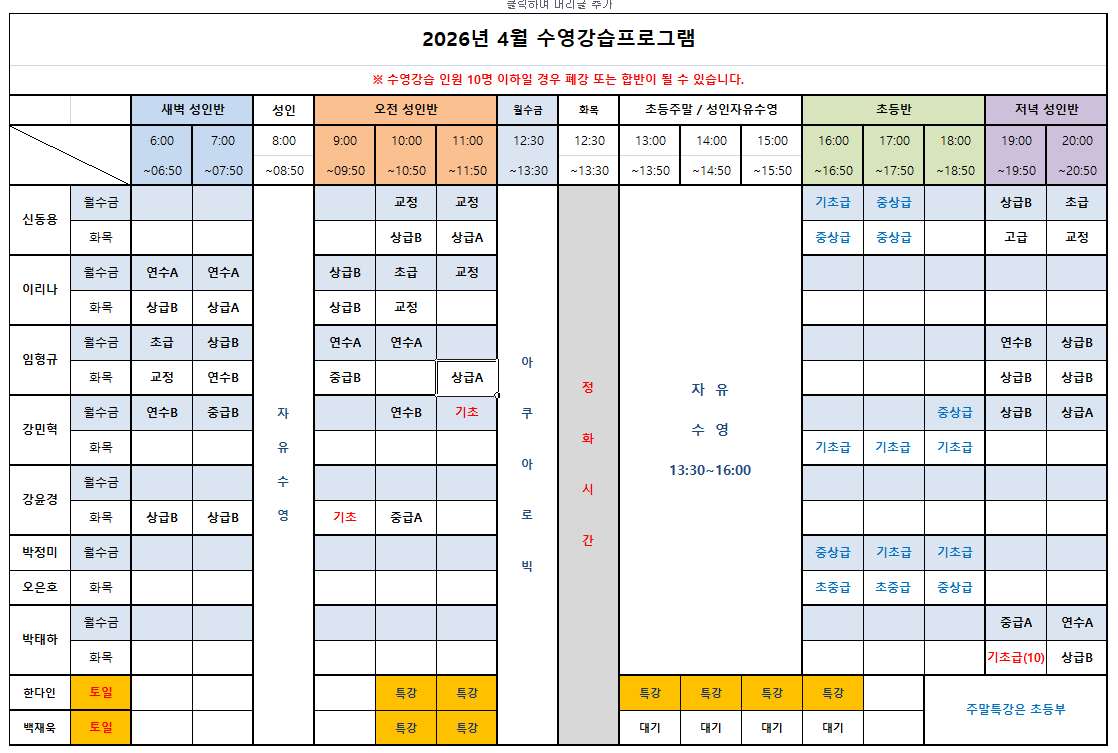 26년 4월 수영 강습시간표 작성자표승수본부장|작성시간26.03.16|조회수2,599 목록 댓글 0 글자크기 작게가 글자크기 크게가 다음검색 현재 게시글 추가 기능 열기 북마크 공유하기 신고 센터로 신고 댓글 댓글 0 댓글쓰기 답글쓰기 댓글 리스트