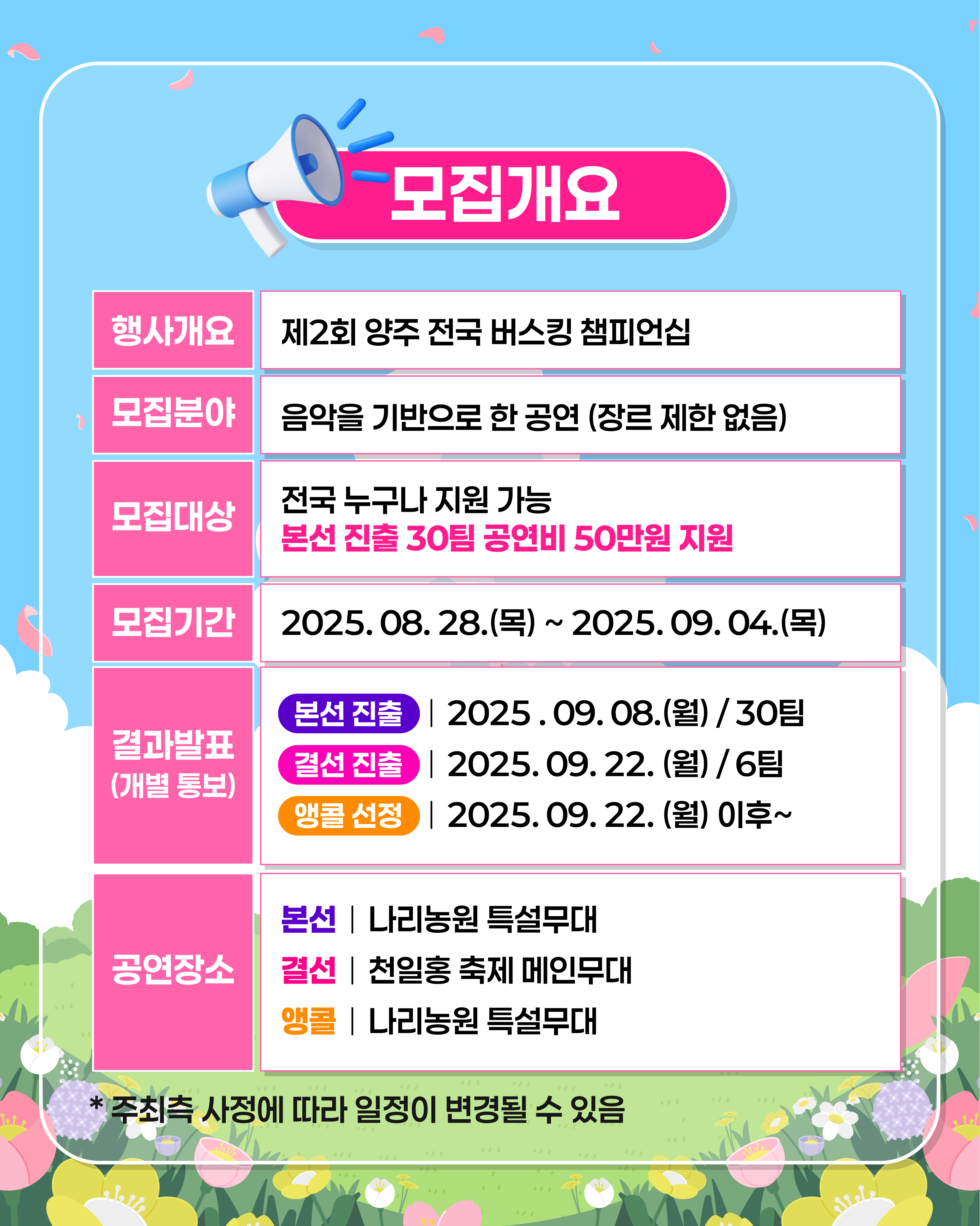 「2025년 제2회 양주 전국 버스킹 챔피언십」개최 안내 공문이 접수되어 첨부와 같이 안내드리오니 관심 있는 학우 분들께서는 많은 참여 부탁드립니다.