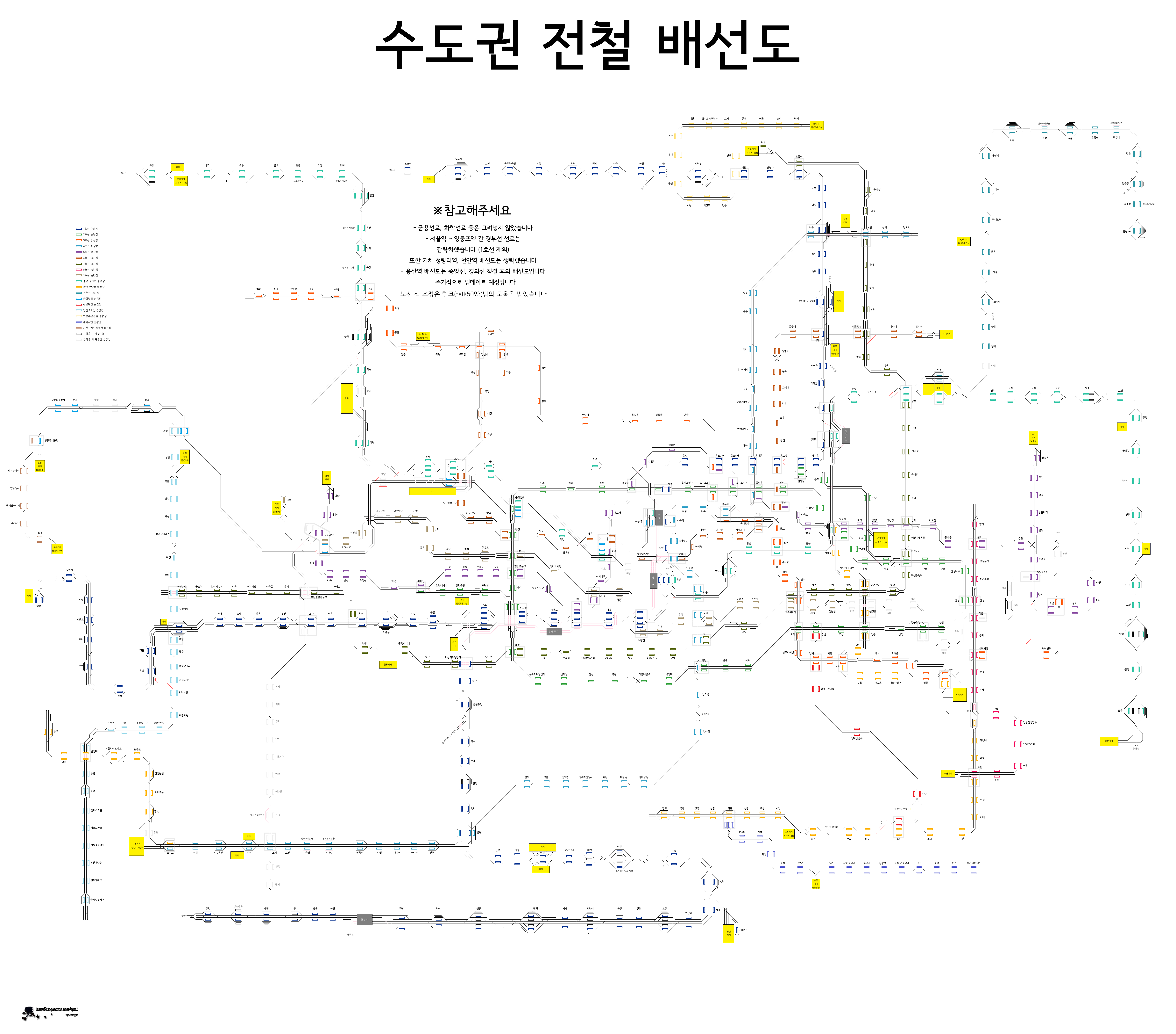 특히 1호선, 중앙선 같은 경우에는 60~70%정도를 위성지도에만 의존하면서 만들었기 떄문에 틀린부분이 많을수도 있습니다