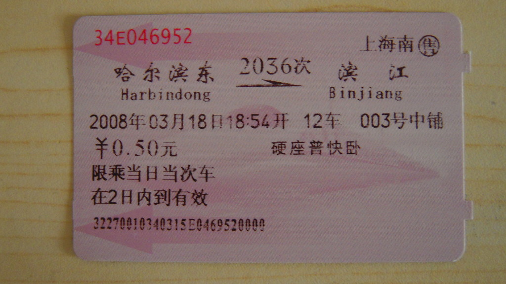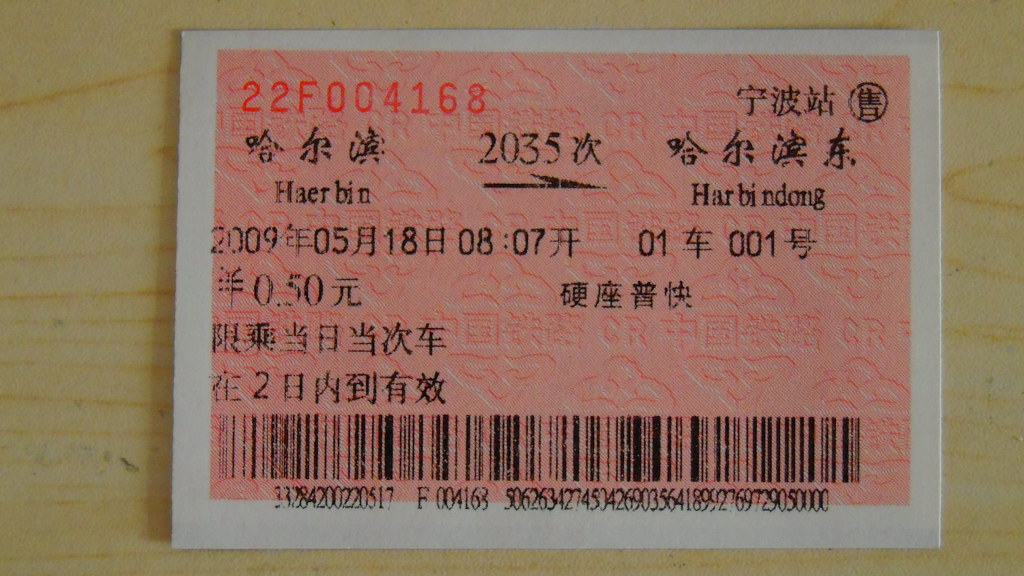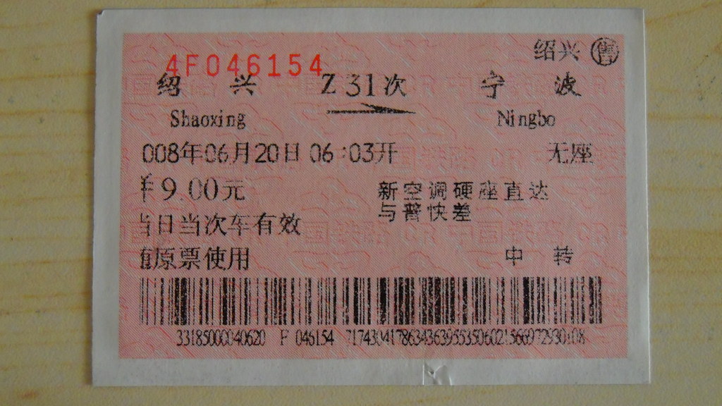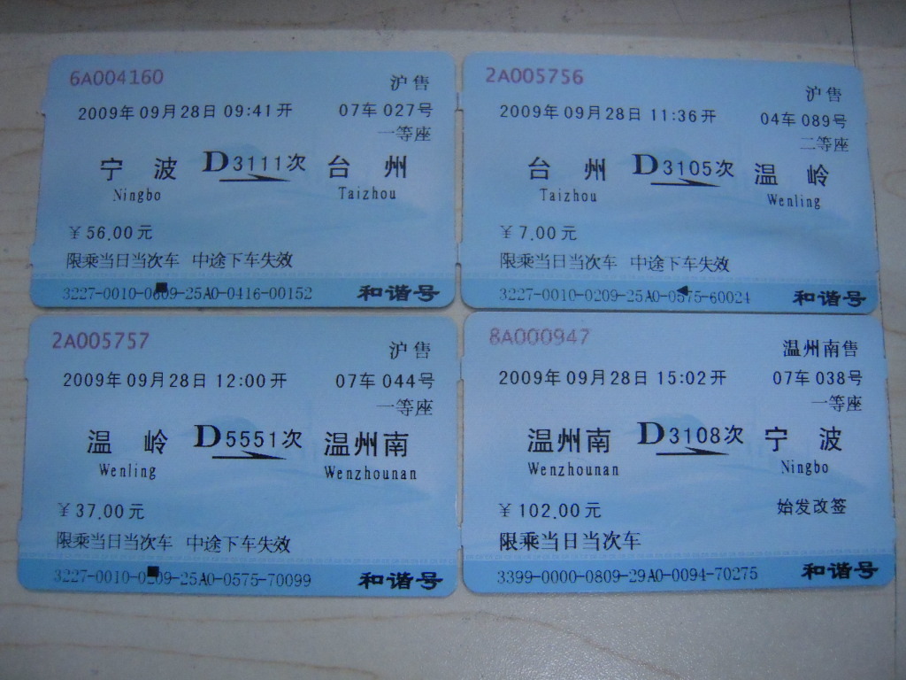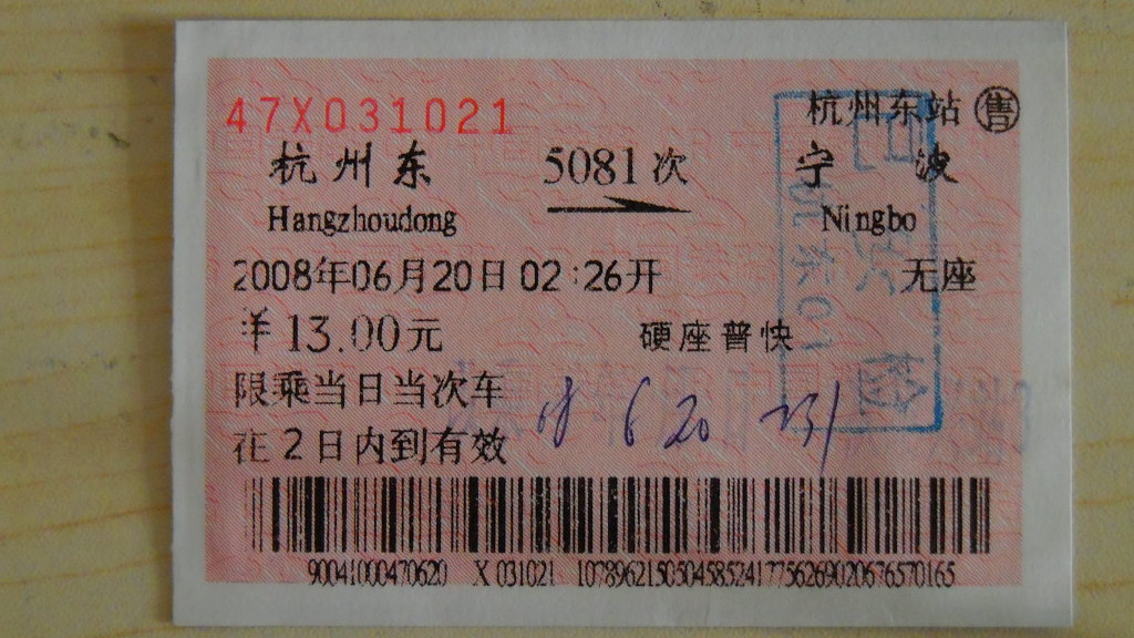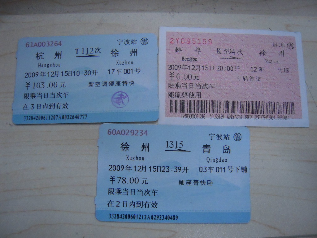 작년 칭다오 갈때 사용했던 기차표..참고로 닝보-항저우는 구간 무임승차....