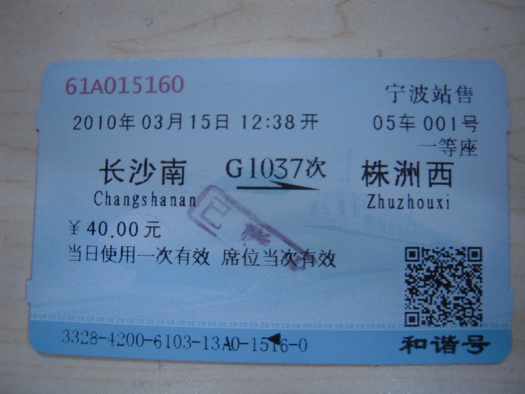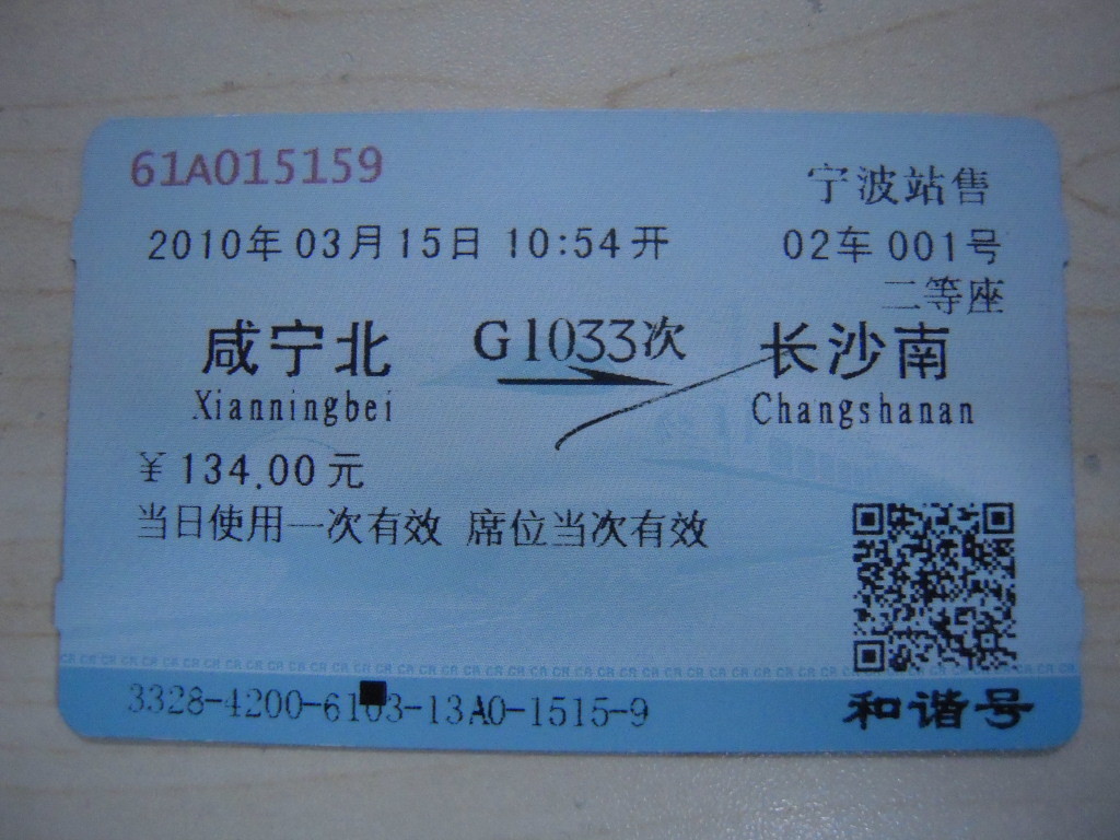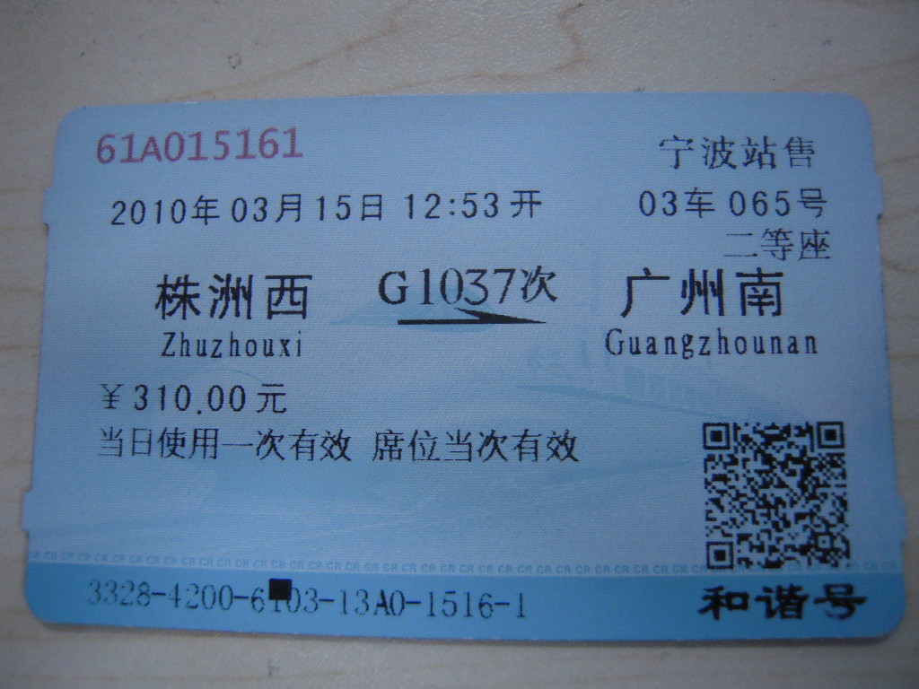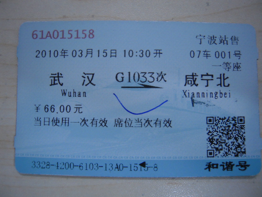 본인이 요번 3월달에 우한-광저우 고속철도 사용했던 기차표...이거 구입하느라고 매표주임하고 한참을 연구함....