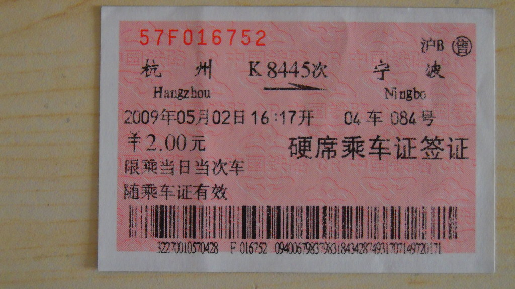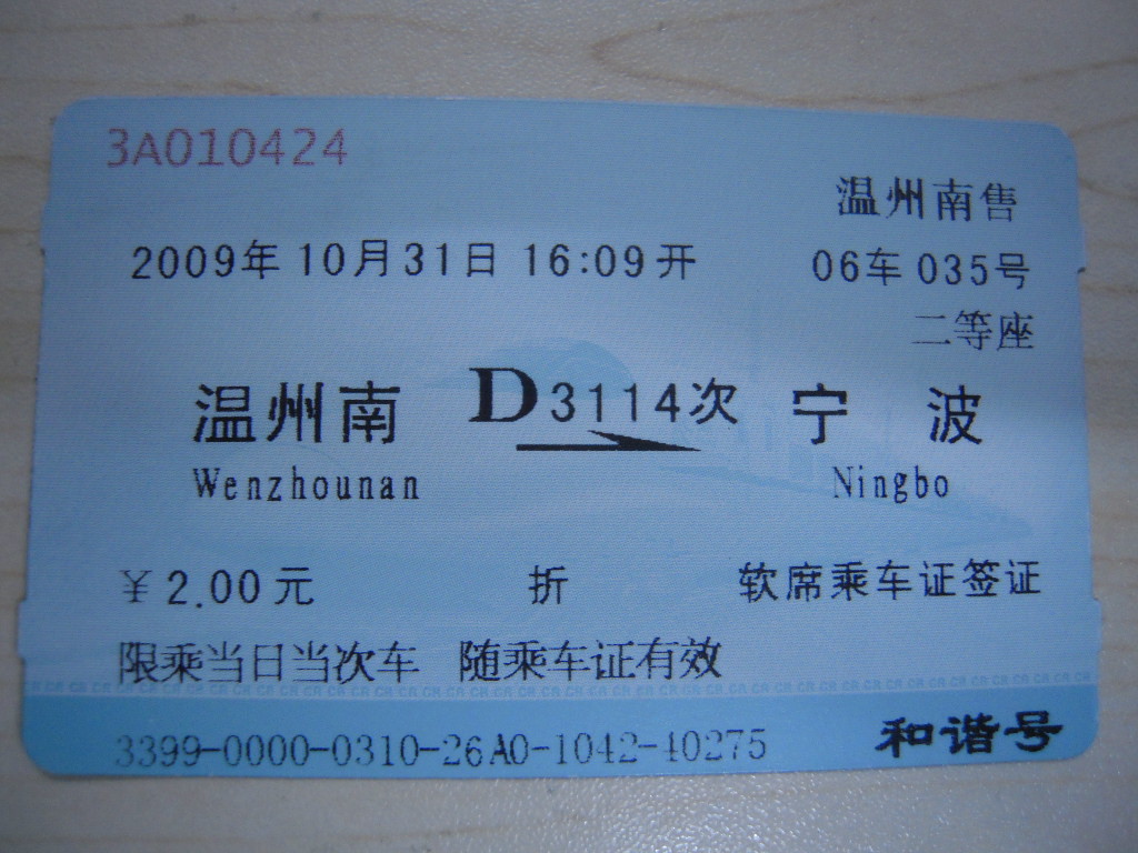 항저우->닝보..철도 직원표..2원임....철도 직원증만 제시하면은 구입가능..참고로 본인도 이표 사용했음....