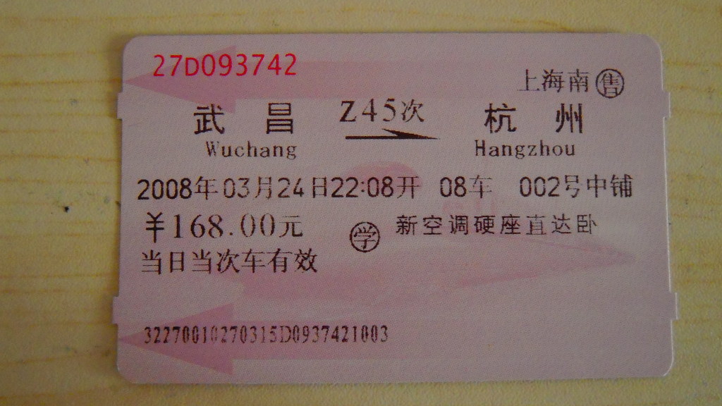 학생표로 구입한 우창->항저우....(원래 중국에서는 외국 유학생들한테 학생표 구입못하게 하죠)