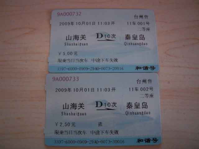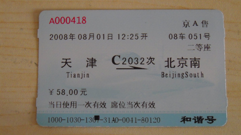 이거는 베이징-텐진 고속철도 개통식 첫날기차표임....베이징 출발편 구입하려다 표 없어서.할수 없이 텐진역 첫 출발 구입함....