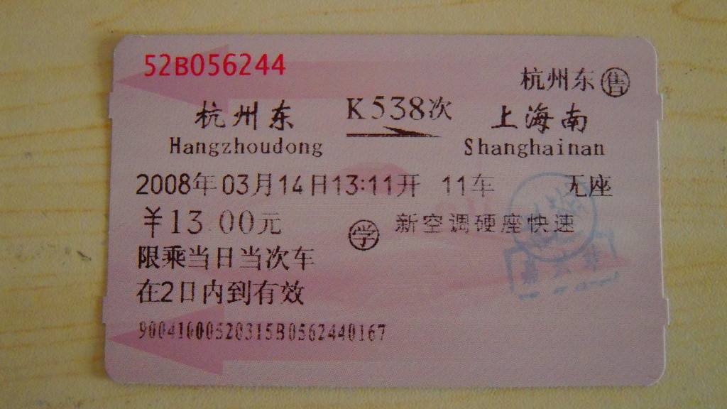 항저우동->상해남..학생표(이거때문에 본인 학생증 더 만들었다는.)