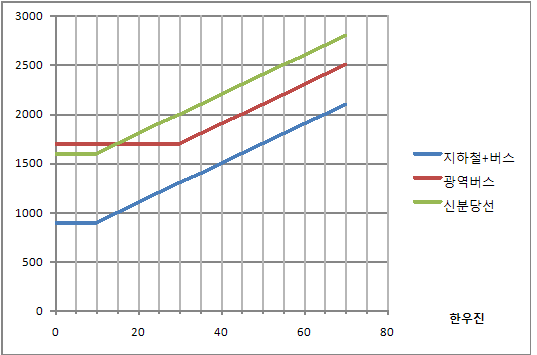 어쨌든 지하철+버스, 광역버스(경기도 거리비례), 신분당선을 표로 비교해봤더니 아래와 같습니다