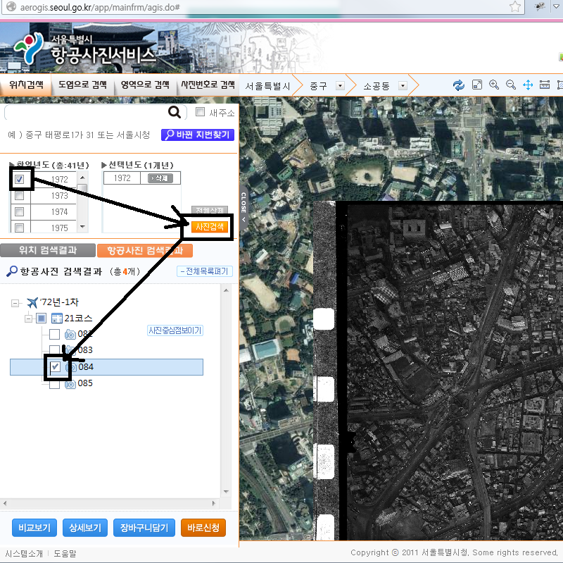 서울 지도 홈페이지 ( http://gis.seoul.go.kr/ ) 에서는 여러가지 지도 외에 1972년부터의 서울 항공사진을 무료로 서비스하고 있습니다.