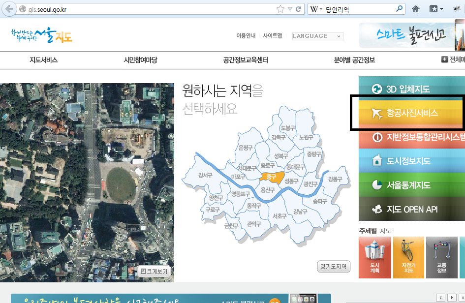 홈페이지에 접속하면 오른편에 항공사진서비스 라는 기능이 있는데요, 여기를 눌러서 들어가면 새 창이 뜹니다.