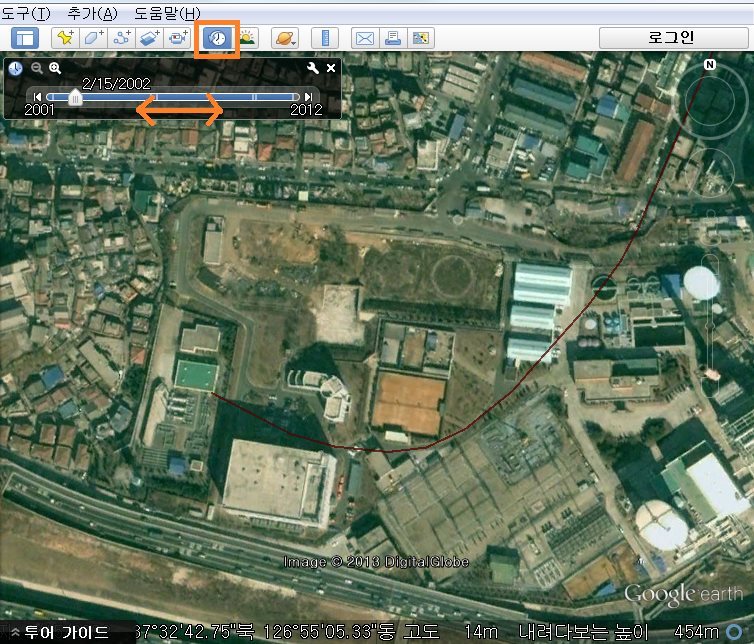 구글어스에서도 과거 위성 사진을 제공해주는데, 반시계 아이콘을 클릭한 뒤 왼쪽 위에 뜨는 시간 막대를 이리저리 끌어다 보면 옛날 위성 사진이 제공되는 곳은 위성 사진을 볼 수가 있습니다.