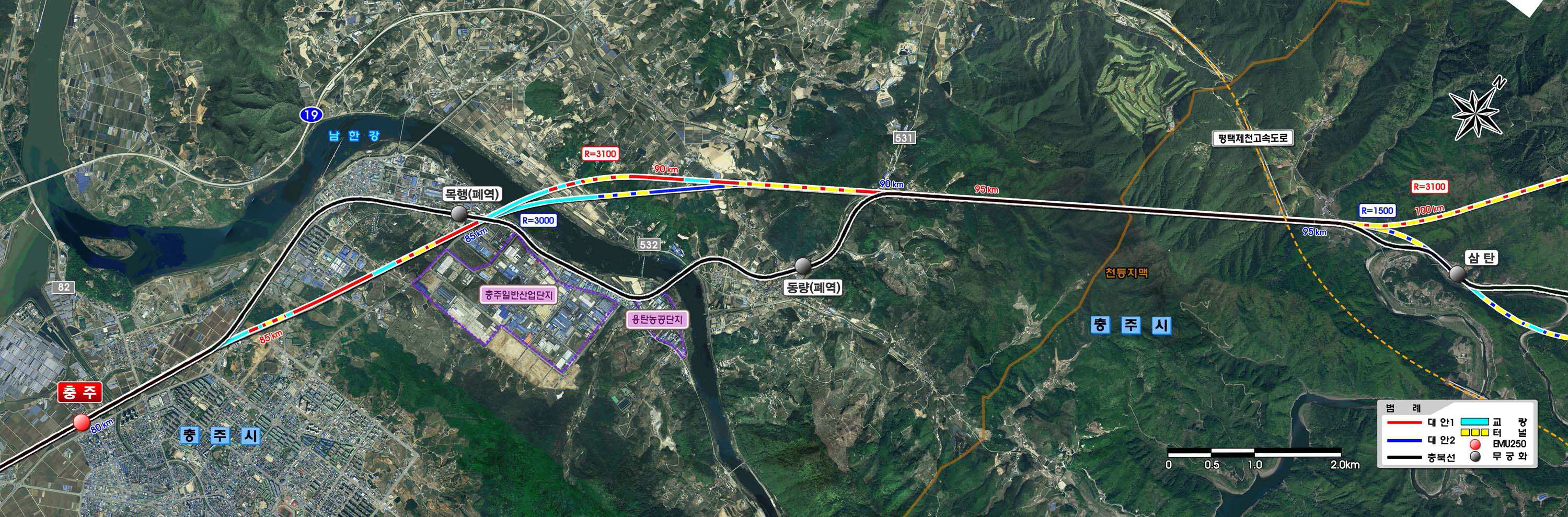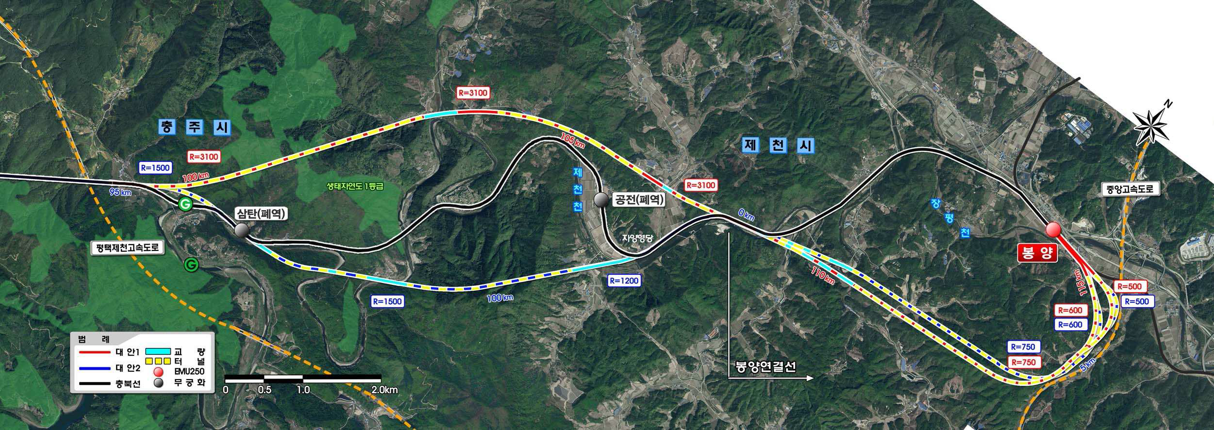 충북선 개량 타당성 점수 확보를 위해 어쩔수없이 봉양역 수요도 잡아야해서 그랬는지 모르겠지만, 목포~익산~대전~강릉 최단거리&고속연결을 목적으로한 개량이라면 봉양직결선은 다소 무리가 있어보이네요. 정 필요하다면 앞서 언급한 연박리 삼각선즈음에 동화역이나 만종역정도의 작은 규모로 '서봉양역'을 세워도 괜찮았을테구요. -