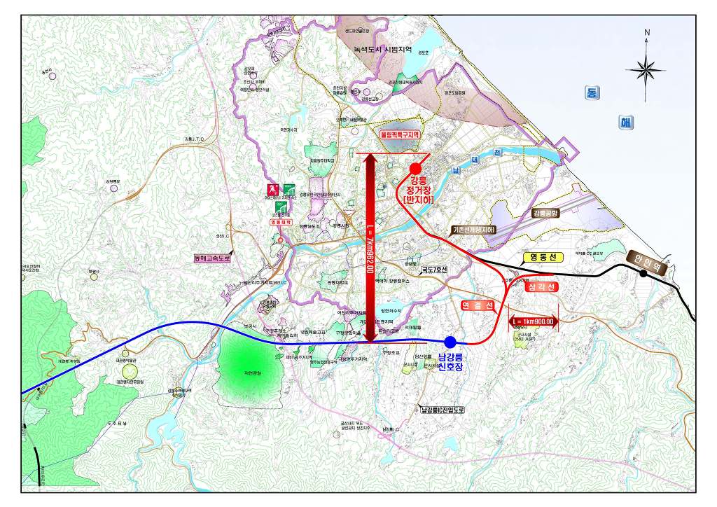 강릉역 반지하화 및 강릉시내 영동선 지하화 대형 노선도 (지도상) 입니다.