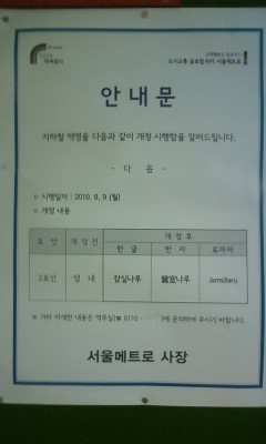 2010년 8월 9일 부터 성내역이 잠실나루역으로 변경한다는 안내문입니다.