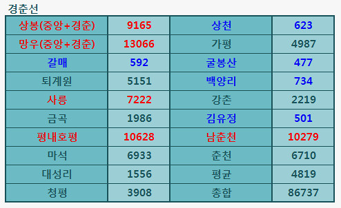 1. 가평, 남춘천, 춘천역 ITX 개통으로 전철 승하차 급감, 평내호평은 오히려 소폭 증가