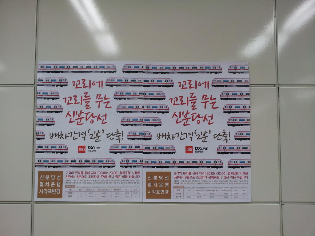 마치 일본에서 보는것 같은 조금 화려한 다이어개정 포스터입니다. 국내에서 이런식의 증차 안내 포스터를 보는것은 제 기억으로도 처음입니다. 게다가 "꼬리에 꼬리를 무는 신분당선"이라는 입에 착착 붙는 캐치프레이즈까지 붙었습니다.