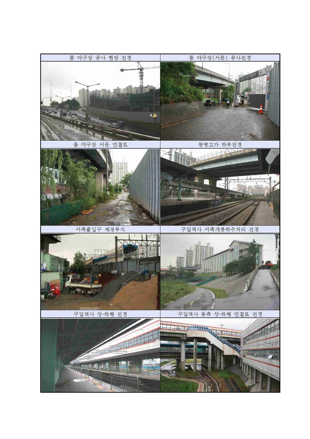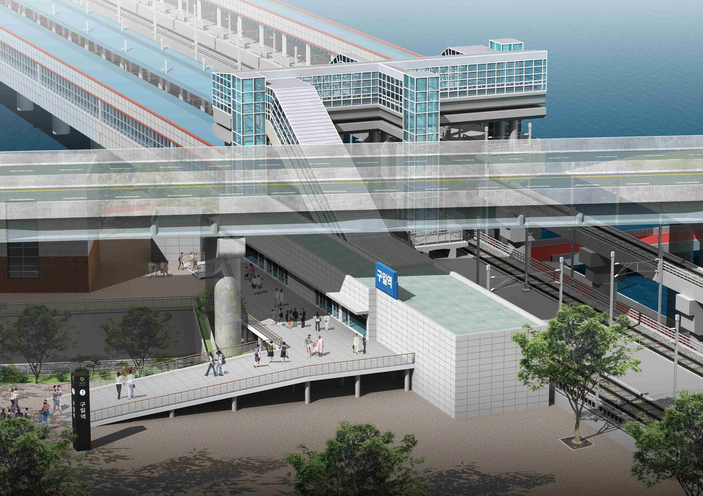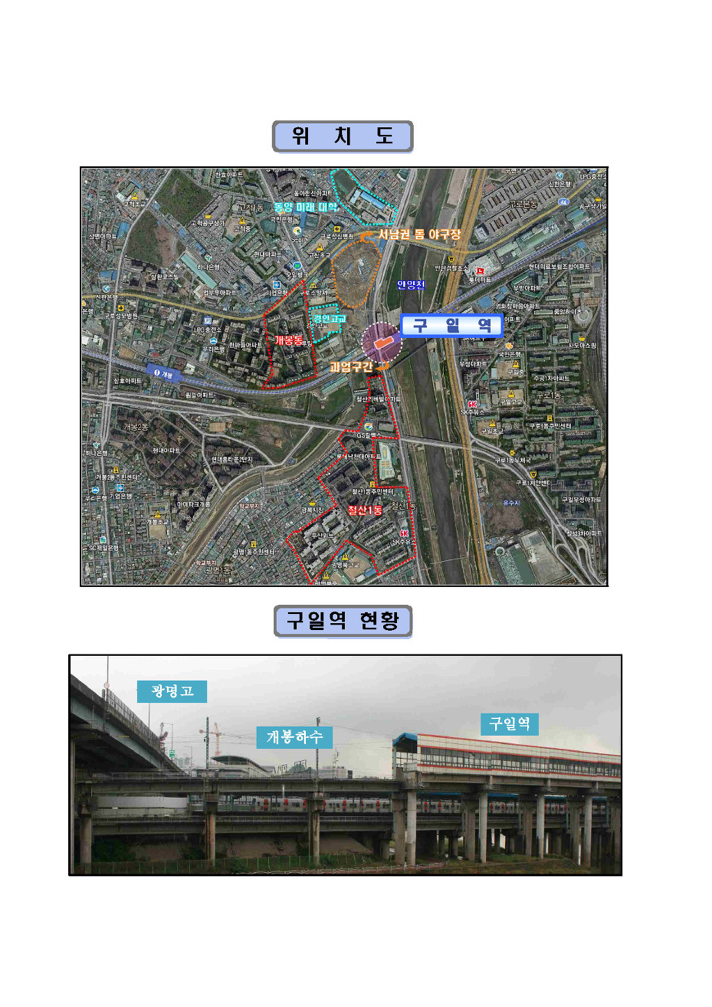 - 일단 구일역 승강장 서쪽끝 상부에 구름다리를 만들고 (구름다리 위치는 광명고가도로 동쪽임)