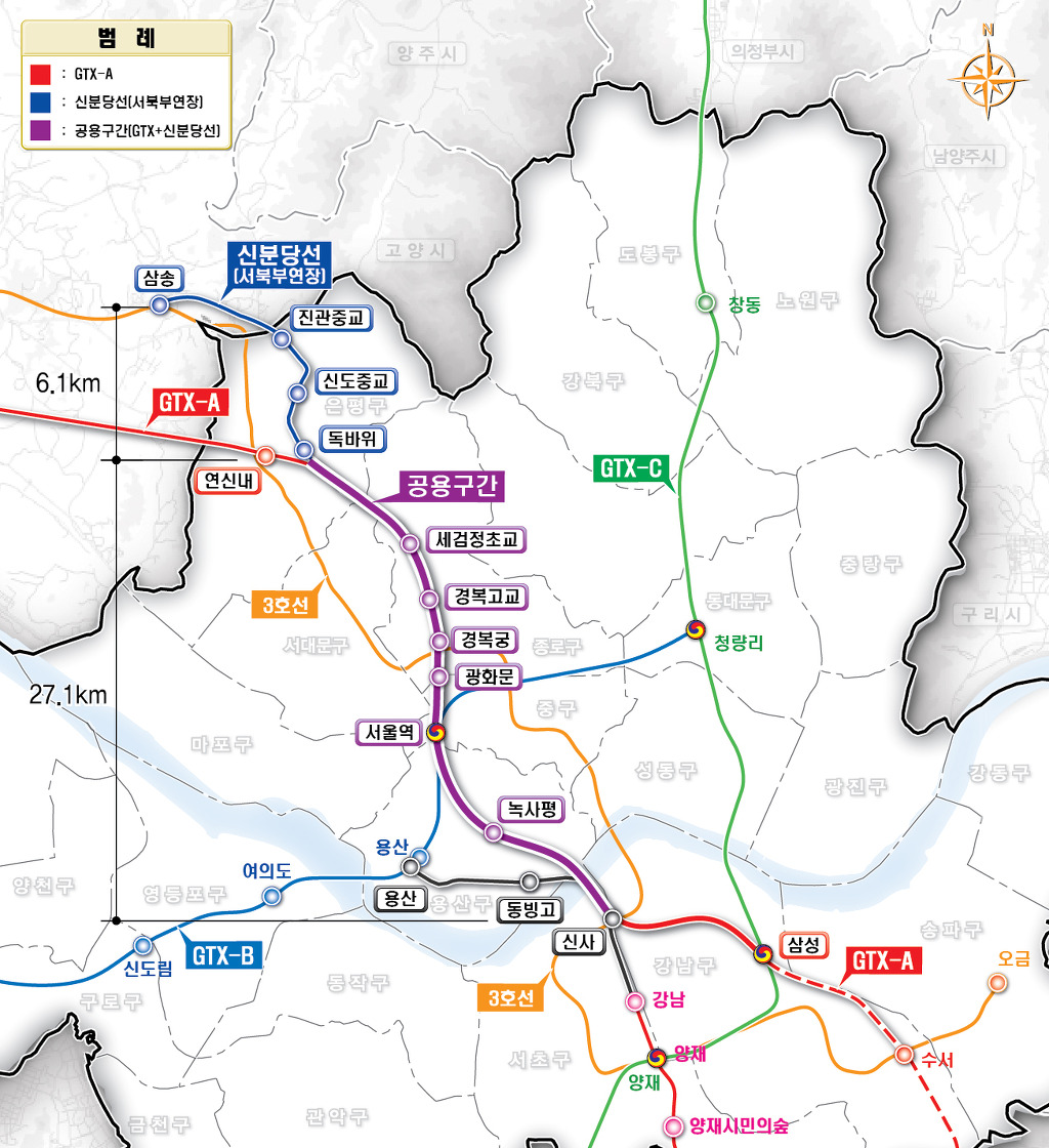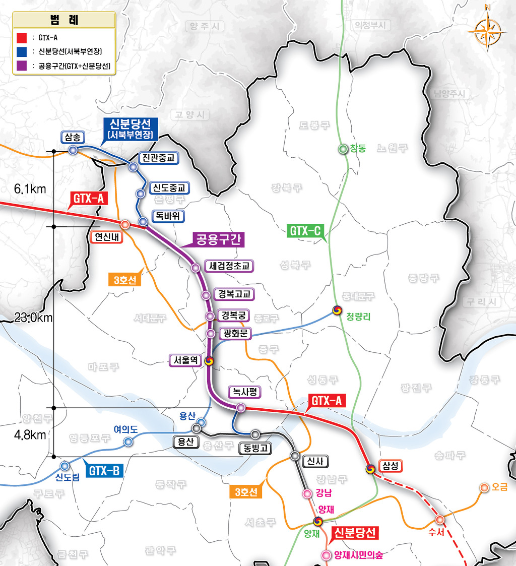 유사한 경로로 지나가는 신분당선 북부구간과 GTX 킨텍스-삼성 구간을 일부 공용하여 짓고