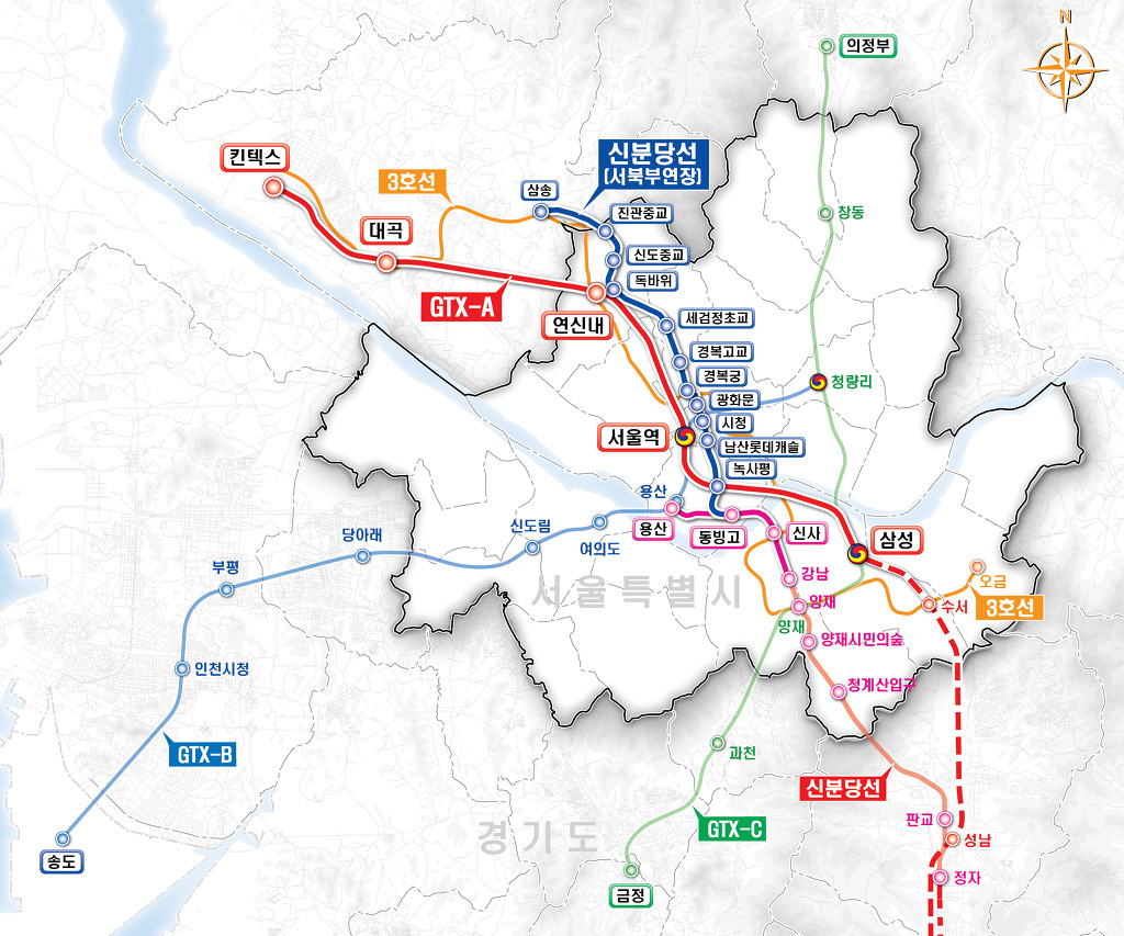 서울시가 구상중인 신분당선과 GTX 노선공유 지도상 노선도 입니다.