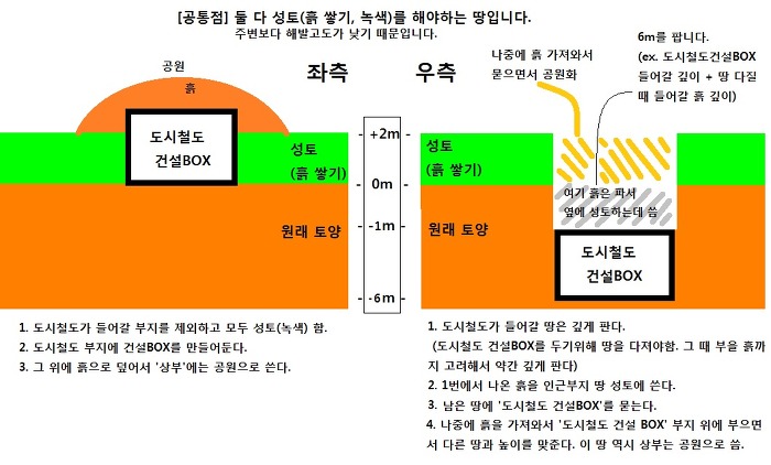 '오른쪽'은 그 일대 '성토할 흙이 모자란다길래' 조금 깊이파서 그 일대 쓸 흙을 일부 자급자족하는겁니다. 저심도 지하철이 9m 정도 파내려간다는데 그것보다 약간 덜 내려갑니다.