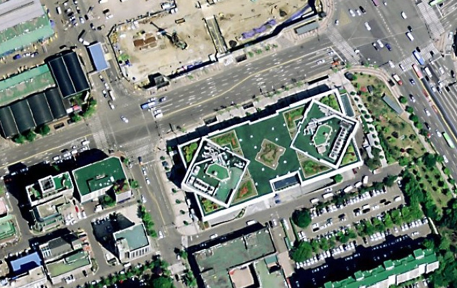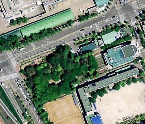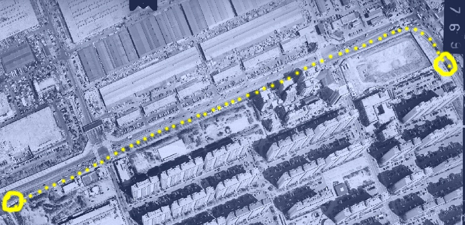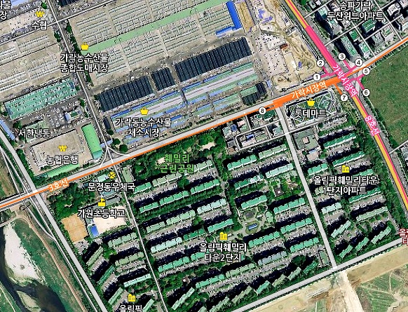 항공사진으로만 보아선 위치를 분간하기 어려울거 같아서 제가 임의로 표기 하였습니다. 왼쪽하단의 원이 바로 수직구이고 노란 점선이 임시선로, 그리고 오른쪽하단의 원이 임시 터널입니다. 이 구간을 95년 하반기에 5호선 도입때 쓰고 96년 하반기에 8호선 도입때도 사용 하였습니다.