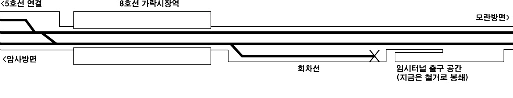 임시터널로 진입후 호선열차는 가락시장역을 지나 5호선 연결선로 거쳐 상일동차량기지로 반입하였으며 8호선은 바로 모란차량기지로 반입을 하였습니다. 8호선 모란행 열차를 타고 우측을 자세히 보시면 회차선지나서 또다른 빈 공간을 잠깐 보일텐데 그곳이 바로 임시터널 출구 터 입니다. 물론 지금은 5호선이 완전히 개통되어서 신정지선 연결구간 으로도 연결되었기 때문에 더이상 쓸모없게 되어서 철거봉쇄상태입니다.