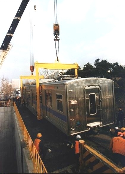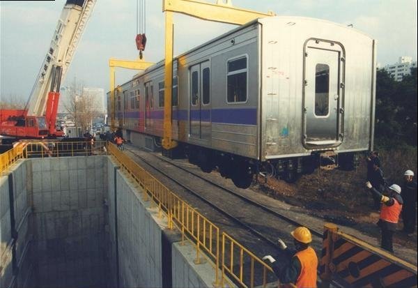 기중기 두대로 한량씩 일일히 들어올리기에 번거로움이 있었지만 당시 오금구간까지 임시로 터널을 뚫는 것보다는 비용이 절감이 있었습니다. 물론 지금은 3호선이 연장되었지만요. 그리고 가락시장역 사거리까지 임시선로를 도로 위에다 가설후 임시터널입구로 다시 들어와 8호선 가락시장역과 연결하여 도입을 했었습니다.