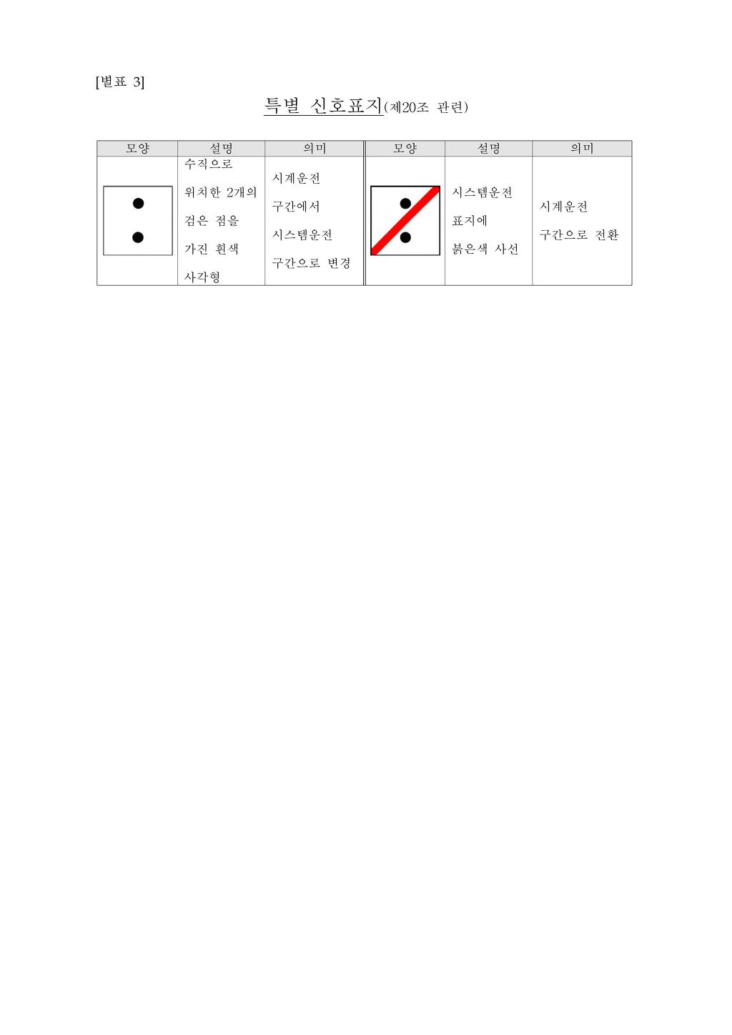 제20조(특별 신호표지) 시계운전 구간에서 시스템운전(운전자가 차량운행 제어설비에 의존하여 노면전차를 운전하는 것을 말한다. 이하 같다) 구간으로 전환하거나 시스템운전 구간에서 시계운전 구간으로 전환하는 곳에는 별표 3에 따른 특별 신호표지를 설치하여야 한다.