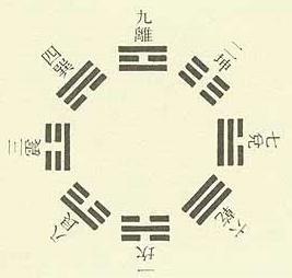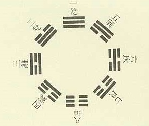 「복희선천팔괘도(伏羲先天八卦圖)」 | 일(一) - 건괘(乾卦) - 남방(南方) 이(二) - 태괘(兌卦) - 동남방(東南方) 삼(三) - 이괘(離卦) - 동방(東方) 사(四) - 진괘(震卦) - 동북방(東北方) 오(五) - 손괘(巽卦) - 서남방(西南方) 육(六) - 감괘(坎卦) - 서방(西方) 칠(七) - 간괘(艮卦) - 서북방(西北方) 팔(八) - 곤괘(坤卦) - 북방(北方) <선천팔괘방위(先天八卦方位)> |