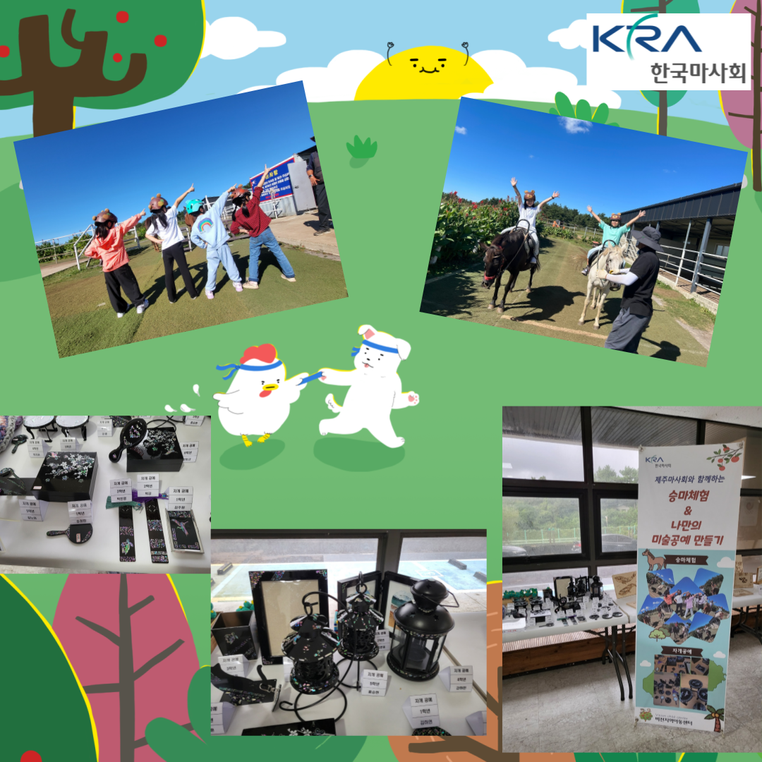 서귀포시 비전지역아동센터 (센터장 박명훈) 프로그램에 참여하는 38 명의 아동들이 제주 마사회 지원사업으로 10월4일 중문승마체험장에서 승마체험을 하고 10월 10일부터 11일까지 자개아트 (미술공예) 만들기에 참여하여 즐거운 추억을 만들었다.