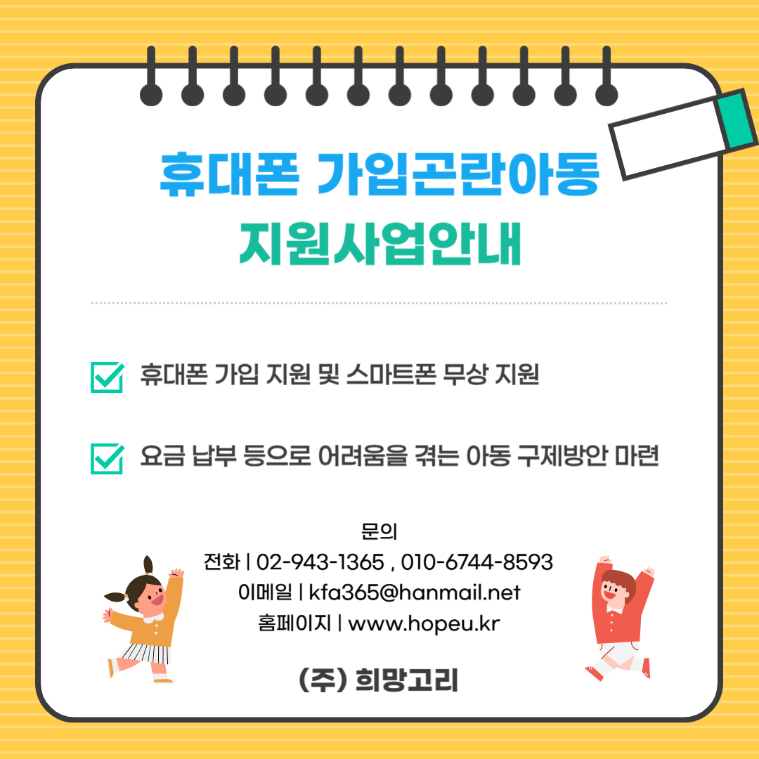 2026년 지역아동센터 휴대폰가입곤란아동 지원 서비스 안내 작성자지역아동센터제주지원단|작성시간26.03.24|조회수45 목록 댓글 0 글자크기 작게가 글자크기 크게가 안내문및 신청양식.hwp57.00KB 첨부파일첨부된 파일이 3개 있습니다. png 파일 카드뉴스1.png 다운로드 png 파일 카드뉴스2.png 다운로드 hwp 파일 안내문및 신청양식.hwp 다운로드 다음검색 현재 게시글 추가 기능 열기 북마크 신고 센터로 신고 댓글 댓글 0 댓글쓰기 답글쓰기 댓글 리스트