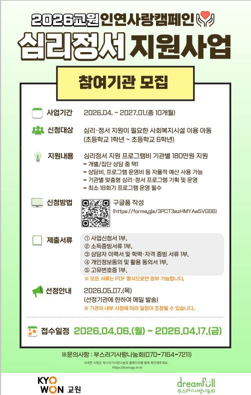 2026교원 인연사랑캠페인<심리정서지원사업> 참여기관모집 작성자지역아동센터제주지원단|작성시간26.04.06|조회수61 목록 댓글 0 글자크기 작게가 글자크기 크게가 붙임1. 2026 교원 인연사랑캠페인 심리정서지원사업 참여기관 신청 안내문.hwp116.00KB붙임2. 2026 교원 심리정서지원사업 신청서 양식.hwp59.50KB붙임3. 2026 교원 심리정서지원사업 동의서 양식.hwp266.50KB 첨부파일첨부된 파일이 4개 있습니다. etc 파일 2026 교원 심리정서지원사업 포스터.JPG 다운로드 hwp 파일 붙임1. 2026 교원 인연사랑캠페인 심리정서지원사업 참여기관 신청 안내문.hwp 다운로드 hwp 파일 붙임2. 2026 교원 심리정서지원사업 신청서 양식.hwp 다운로드 hwp 파일 붙임3. 2026 교원 심리정서지원사업 동의서 양식.hwp 다운로드 다음검색 현재 게시글 추가 기능 열기 북마크 신고 센터로 신고 댓글 댓글 0 댓글쓰기 답글쓰기 댓글 리스트