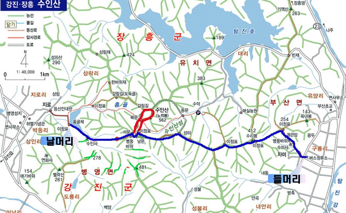 ☞ A코스 : 자미마을 → 수미사 → 계관암 → 수리봉 → 수인산성 → 노족봉 → 북문 → 서문 → 병풍바위 → 수인사 → 흠골재 →지로마을 (약 12km, 5시간 30분 소요)