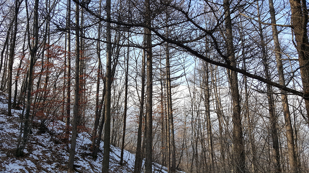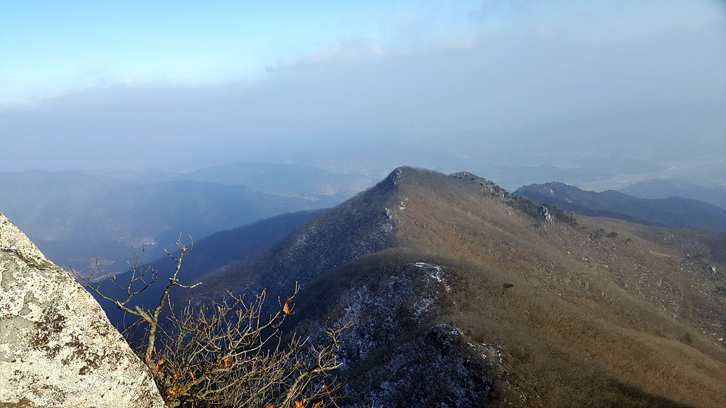 능선에 올라 서니 나뭇가지 사이로 그림 같은 풍광이 사진으로는 잘 안보이....