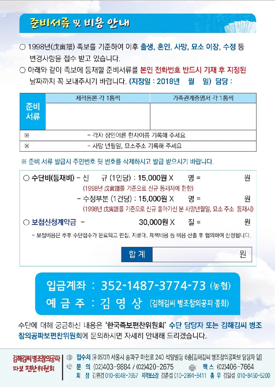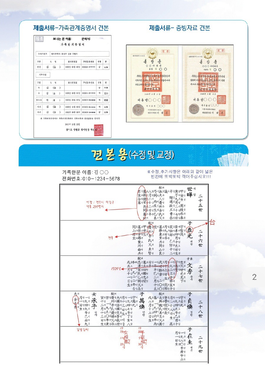 한국족보편찬위원회 홈피 공지사항을 참고하시거나 전화주시면 자세히 안내해드리겠습니다.