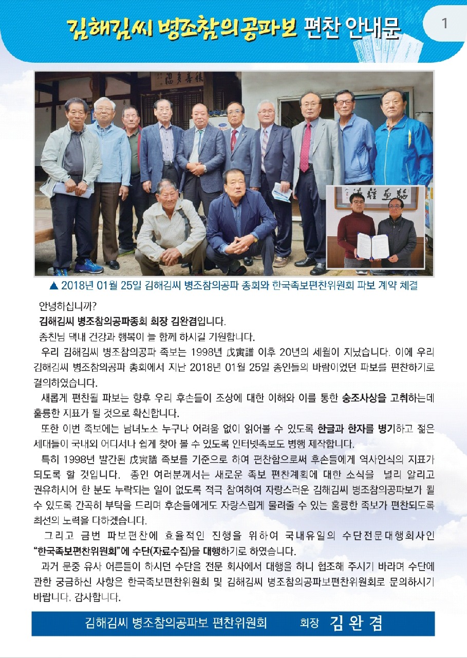 한국족보편찬위원회에서는 2018년 김해김씨 병조참의공 종회와 족보발행 계약을 체결하여
