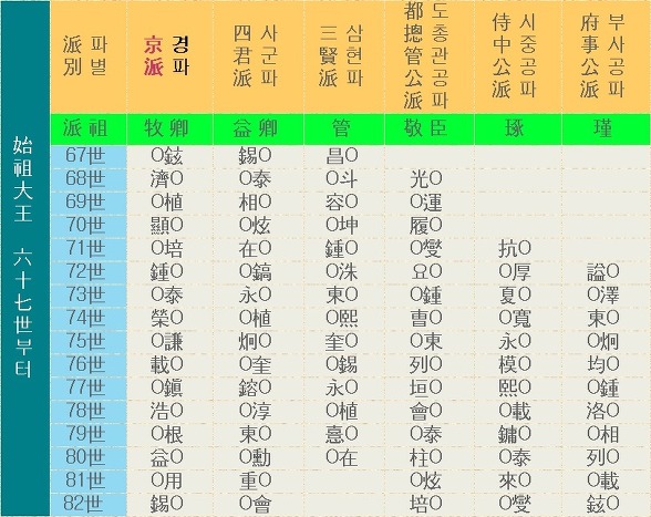 파명(派名)을 살펴보면, 영돈령공준파(領敦寧公遵派), 진주목사공형파(晉州牧使公형派), 충정공준영파(忠貞公俊榮派), 충경공경세파(忠敬公景世派), 송암공질파(松菴公秩派), 만은공길상파(晩隱公吉祥派), 충의공문기파(忠毅公文起派), 대사성공지파(大司成公智派), 도순찰사공문제파(都巡察使公文齊派), 상서공문희파(尙書公文熙派)로 나뉘어졌다.