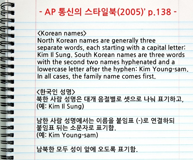 2. 세계 주요 언론사는 한국인의 이름을 어떻게 표현할까요? 그렇다면 ‘성+이름’ 순으로 한국인의 성명을 표현하는 것이 최근 변화된 걸까요? 사실 그렇지는 않아요. 국내에서 영어식 어순을 따르면서 생긴 혼란이지, 세계의 주요 언론사들은 이미 1970년대부터 한국인들의 성명을 ‘성+이름’ 순으로 일관되게 표현했어요. ^^ [성명의 영문표기 - AP통신 스타일북에서 명문화화 한국인 성명 표기법] 전 세계 언론이 표준으로 삼는 에이피(AP: Associated Press)통신의 스타일 북(Style Book)에는 한국인과 중국인의 성명 표기 방식을 ‘성+이름’ 순으로 쓰도록 명문화하고 있어요. 미국 언론사인 CNN도 이를 따르고 있고요. 이는 각국의 언어문화 전통을 존중하는 것이 바로 국제 표준임을 보여주는 증거가 아닐까요? [성명의 영문표기 - AP통신 스타일북에서 명문화화 한국인 성명 표기법] 해외 주요 언론사들의 한국인 성명 표기 사례 [성명의 영문표기 - 세계 주요 언론사들의 한국인 성명 표기 사례]