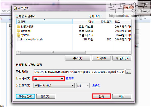 ▼ 압축을 위한 팝업창이 뜨면 압축 방식을 ZIP 으로 선택하고 [압축] 버튼을 누릅니다.